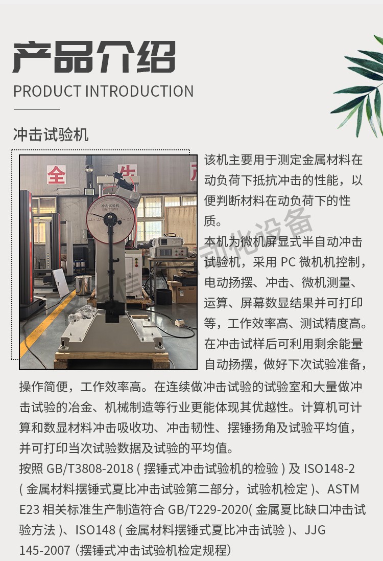 本機為微機屏顯式半自動沖擊試驗機,采用PC微機機控制,電動揚擺、沖擊、微機測量、運算、屏幕數顯結果并可打印等,工作效率高、測試精度高。在沖擊試樣后可利用剩余能量自動揚擺,做好下次試驗準備,操作簡便,工作效率高。在連續做沖擊試驗的試驗室和大量做沖擊試驗的冶金、機械制造等行業更能體現其優越性。計算機可計算和數顯材料沖擊吸收功、沖擊韌性、擺錘揚角及試驗平均值,并可打印當次試驗數據及試驗的平均值。 按照 GB/T3808-2018 (擺錘式沖擊試驗機的檢驗)及 ISO148-2(金屬材料擺錘式夏比沖擊試驗第二部分,試驗機檢定)、ASTM E23 相關標準生產制造符合 GB/T229-2020(金屬夏比缺口沖擊試驗方法)、ISO148 (金屬材料擺錘式夏比沖擊試驗)、JJG 145-2007 (擺錘式沖擊試驗機檢定規程) 四、主要技術指標: 1、沖擊能量:150J、300J 2、擺錘預揚角:150° 3、擺軸中心至沖擊點距離:750mm 4、沖擊速度:5.2m/s 5、試樣支座跨距:40mm 6、鉗口圓角:R1-1.5mm 7、沖擊刀刃圓角:R2-2.5mm 8、沖擊刀厚度:16mm 9、角度準確度:±0.1° 10、試樣尺寸:10×10×55mm 11、外形尺寸:2124 mm×600 mm×1340 mm 12、試驗機凈重:450Kg 13、電源:交流三相 380V±10% 50HZ 5A 14、環境條件:周圍環境中無腐蝕介質,無震動,無強電磁場干擾。 五、設備主要配置: 1、300焦耳主機一臺; 2、150J、300J 擺錘各一個 3、取擺傳動裝置一套(裝在主機上) 4、自動掛擺裝置一套(裝在主機上) 5、保險機構一套(裝在主機上) 6、安全防護裝置一套 7、擺錘拆卸器一只 8、支座調校器一只 9、試樣對中器一只 10、聯想打印機一套 專用測量軟件一套