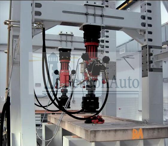 橋梁低周反復(fù)加載試驗(yàn)系統(tǒng)方案描述: 橋梁低周反復(fù)加載試驗(yàn)系統(tǒng)主要組成部分有: 1.自平衡門式反力框架、1套 2.伺服作動(dòng)器:3000KN/1500雙出桿作動(dòng)器各1只; 3.伺服動(dòng)力液壓站;大流量遠(yuǎn)程控制伺服液壓系統(tǒng),包括分油閥塊和管路。 4.?dāng)?shù)據(jù)采集控制系統(tǒng):雙通道靜載控制器,包括擴(kuò)展采集和軟件 5.各路力傳感器和位移傳感器 6. 根據(jù)需要配置各種球鉸支座 NO.1自平衡門式反力框架 橋梁低周反復(fù)加載試驗(yàn)系統(tǒng)功能及基本參數(shù): 1、為結(jié)構(gòu)試驗(yàn)提供多功能綜合反力框架; 2、多功能綜合反力架采用自平衡概念設(shè)計(jì); 3、根據(jù)不同的試驗(yàn),反力架橫梁液壓升降自由調(diào)節(jié); 4、為加載設(shè)備、結(jié)構(gòu)試件預(yù)留相應(yīng)的安裝連接; 5、主梁在可調(diào)節(jié)加載范圍內(nèi)豎向承載力設(shè)計(jì)值為4000kN; 6、反力架可以抵抗2000kN的雙向水平荷載,可抵抗偏壓柱試驗(yàn)、復(fù)雜節(jié)點(diǎn)加載試驗(yàn)時(shí)產(chǎn)生的水平反力。 7、反力架采用Q345-B結(jié)構(gòu)鋼; 8、上橫梁配有獨(dú)立的升降系統(tǒng),上橫梁升降操作便捷,安全。 反力架材料選用Q345-B鋼板,試驗(yàn)空間大,且高度空間可調(diào)整,側(cè)向也需要進(jìn)行施加載荷,這就要求整體框架要有足夠的剛度,底座、立柱、橫梁采用等強(qiáng)度廂型梁焊接結(jié)構(gòu),立柱帶有斜撐,以抵抗試件的側(cè)向加載力;立柱與底座間緊密接觸,這樣可以在試驗(yàn)過(guò)程中盡量減少立柱的伸長(zhǎng)對(duì)試驗(yàn)結(jié)果的影響。整體框架構(gòu)造及其每個(gè)部件都進(jìn)行有限元分析,并根據(jù)分析結(jié)果反復(fù)進(jìn)行結(jié)構(gòu)的優(yōu)化設(shè)計(jì),以達(dá)到最滿意的效果。 橫梁通過(guò)安裝在兩立柱上的螺栓調(diào)整其垂向位置,操作簡(jiǎn)單,調(diào)整到試驗(yàn)位置后,通過(guò)螺栓進(jìn)行定位鎖緊,消除間隙。為了保證橫梁升降的穩(wěn)定性和安全性,對(duì)升降橫梁用加強(qiáng)螺栓定位。 橫梁配有獨(dú)立的升降機(jī)構(gòu),兩側(cè)固定有升降用舉升油缸,通過(guò)控制舉升油缸的升降來(lái)完成對(duì)試驗(yàn)空間的無(wú)級(jí)調(diào)整。 NO.2伺服作動(dòng)器 伺服直線作動(dòng)器是加載系統(tǒng)的執(zhí)行部件,系統(tǒng)通過(guò)作動(dòng)器對(duì)被測(cè)試件施加試驗(yàn)力。伺服直線作動(dòng)器由作動(dòng)器本體、伺服閥塊組、球鉸關(guān)節(jié)支座、流體連接件等部分組成。作動(dòng)器內(nèi)置磁致伸縮位移傳感器用于測(cè)量試驗(yàn)位移,負(fù)荷傳感器安裝在作動(dòng)器活塞桿前端用于測(cè)量試驗(yàn)負(fù)荷,負(fù)荷傳感器采用美國(guó)世銓公司試驗(yàn)機(jī)專用動(dòng)態(tài)高精度負(fù)荷傳感器。伺服閥采用航宇試驗(yàn)機(jī)專用電液伺服閥。 作動(dòng)器結(jié)構(gòu)特點(diǎn): l 系統(tǒng)采用消隙裝置,力值自動(dòng)定心,減小側(cè)向力,降低拉壓試驗(yàn)時(shí)的沖擊,改善試驗(yàn)波形。伺服直線作動(dòng)器兩端采用球鉸關(guān)節(jié)支座結(jié)構(gòu),最大限度的減少來(lái)自被試件側(cè)向力對(duì)作動(dòng)器的損傷,關(guān)節(jié)支座結(jié)構(gòu)采用模塊化設(shè)計(jì),拆除后可以進(jìn)行后法蘭連接,關(guān)節(jié)支座軸承間隙磨損后可調(diào)整,保證試驗(yàn)系統(tǒng)運(yùn)轉(zhuǎn)靈活。結(jié)構(gòu)類似美國(guó)MTS公司249 Swivel Base。 l 結(jié)構(gòu)型式:雙出桿,雙作用;參照國(guó)際著名公司MTS的伺服直線作動(dòng)器結(jié)構(gòu)特點(diǎn),采用對(duì)稱四通伺服閥控對(duì)稱(非對(duì)稱)作動(dòng)器原理設(shè)計(jì)。 l 伺服直線作動(dòng)器活塞桿的支撐打破傳統(tǒng)設(shè)計(jì),采用非金屬支撐、大間隙設(shè)計(jì)、高抗側(cè)向力,具有高速不燒結(jié)自潤(rùn)滑的特點(diǎn)。多級(jí)支撐組合導(dǎo)向機(jī)構(gòu),起動(dòng)壓力小于0.3MPa,無(wú)爬行現(xiàn)象。 l 組合密封,高壓密封,低壓密封及間隙回管,油缸總成作到無(wú)滲漏油。組合密封結(jié)構(gòu)具有良好的互換性,方便維修。 l 位移傳感器采用美國(guó)MTS公司磁致位移傳感器,特點(diǎn):具有無(wú)摩擦運(yùn)動(dòng)和真正的無(wú)限分辨率。精度高,可靠性高,位移傳感器內(nèi)置于活塞桿內(nèi),運(yùn)動(dòng)靈活不受外來(lái)干擾。 l 作動(dòng)器活塞采用整體式活塞,特殊熱處理工藝,活塞桿簡(jiǎn)采用超精加工,表面鍍鉻拋光達(dá)Rα0.4u,保證作動(dòng)器高可靠性。 橋梁低周反復(fù)加載試驗(yàn)系統(tǒng)主要技術(shù)指標(biāo) 1l最大橫向負(fù)荷: 拉壓雙向1500kN 1路 2. 最大垂向負(fù)荷: 拉壓雙向3000kN 1路 2l試驗(yàn)力精度: ±0.5%; 3 頻率范圍:0.01-5hz 4 實(shí)驗(yàn)頻率5hz時(shí)振幅:±1mm 5l試驗(yàn)力測(cè)量范圍: 2%~100%FS(全程不分檔) 6l試驗(yàn)力分辨率: 500000碼,且全程分辨率不變 7l有效試驗(yàn)空間: 3500mm×2000mm(長(zhǎng)×寬) 8l橫向作動(dòng)器行程: ±100mm 9l位移分辨率: 0.001mm; 10l位移測(cè)量精度: ±0.1%; 11l內(nèi)置式位移傳感器精度: 優(yōu)于±0.1%; 12l過(guò)載保護(hù): 105%過(guò)載保護(hù)(無(wú)變形、無(wú)機(jī)械損傷)(世銓不能過(guò)