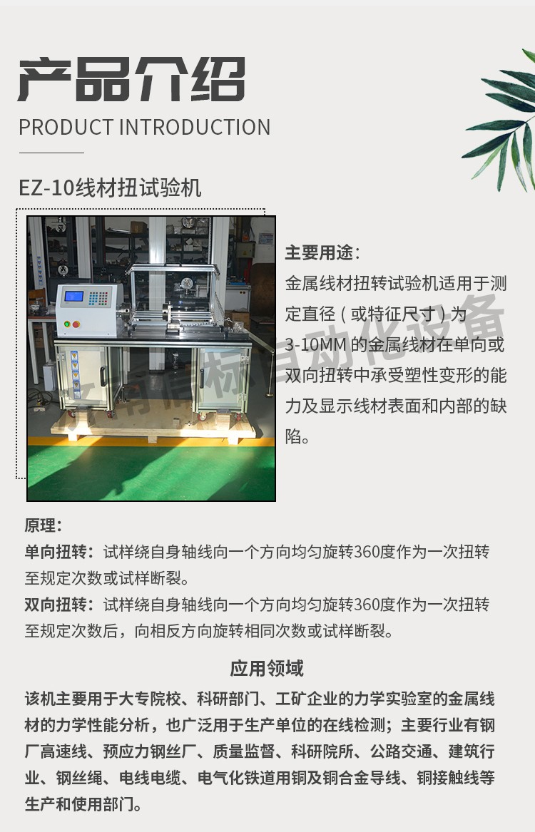金屬線材扭轉試驗機適用于測定直徑(或特征尺寸)為3-10mm 的金屬線材在單向或雙向扭轉中承受塑性變形的能力及顯示線材表面和內部的缺陷。