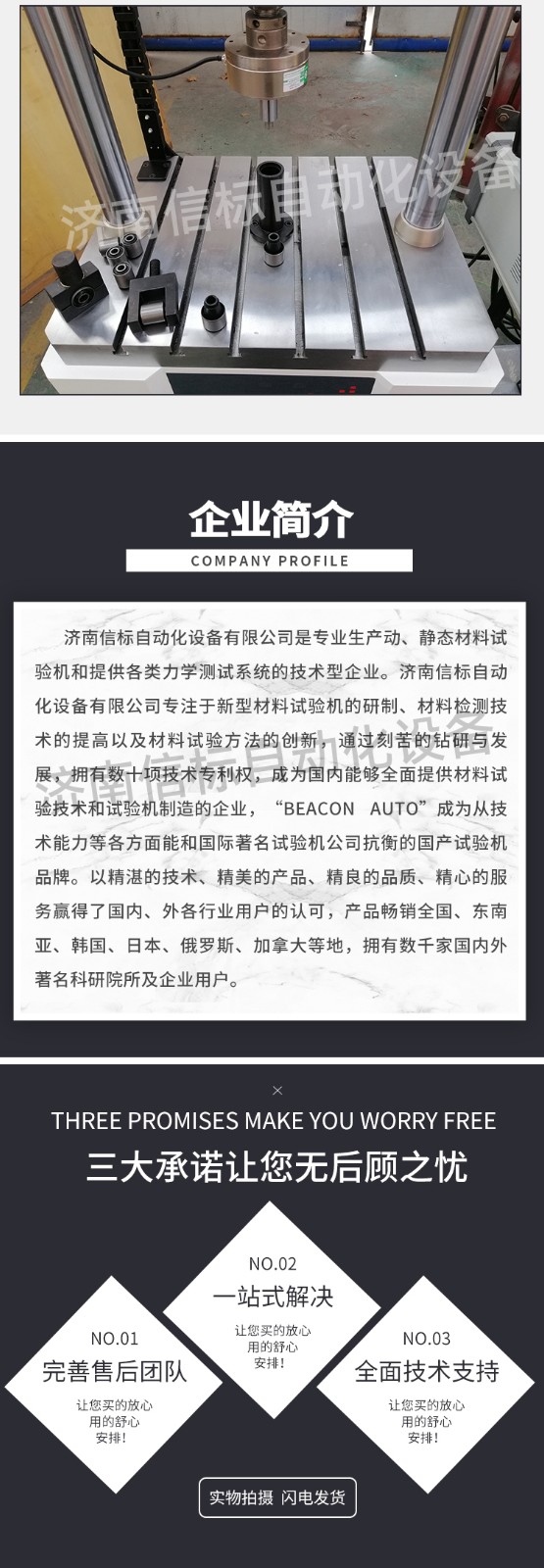 濟南信標自動化設備有限公司主要生產:動靜態(tài)萬能疲勞試驗機,接骨板彎曲試驗機,縫合線拉伸疲勞試驗機,髖膝關節(jié)磨損試驗機,電子萬能試驗機、液壓萬能試驗機、巖石三軸、四軸,電液拉力試驗機,材料試驗機,高低溫蠕變,高低頻疲勞,拉伸、扭轉、杯突等二十多個系列兩千多個的品種。