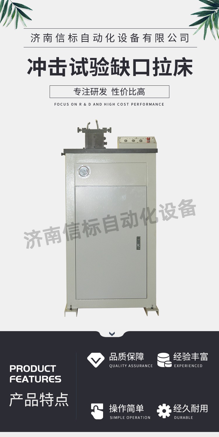 CSY-Y拉床為油泵液壓缸方式驅(qū)動(dòng),可按用戶要求而配置V 型或U 型拉刀,試樣缺口一次加工成型,一次可成功拉制兩個(gè)標(biāo)準(zhǔn)試樣缺口,拉刀采用特殊材料、特殊工藝精密加工制造,硬度高、耐磨性好,使用壽命長,加工出的V 型缺口和U 型缺口(2mm)可滿足GB/T229-2020相關(guān)國家標(biāo)準(zhǔn),由于一次拉削加工成型的原理,其加工同一性極好,可保證所加工的試樣缺口百分之百合格。 三、技術(shù)特點(diǎn): CSL-Y沖擊試驗(yàn)缺口液壓拉床由液壓部分, 主傳動(dòng)部分,電控部分,輔助部分等組成。 液壓部分由油箱、電機(jī)、泵、油缸等組成,主電機(jī)帶泵順時(shí)針旋轉(zhuǎn)吸油,供油缸以2.0m/min的速度帶刀體(V型、U型專用拉刀)上下運(yùn)動(dòng)拉削V型及U型缺口。刀座上設(shè)有潤滑油杯,工作時(shí)向油杯內(nèi)加滿潤滑油(30#機(jī)油或其他潤滑油)。切削前后用刷子蘸少量油刷去鐵屑潤滑刀刃,切削前一定用刷子將鐵屑清除干凈。油缸下有接油盒,接流下的少量潤滑油。可以根據(jù)本機(jī)工作時(shí)間的長短定期清理 四、技術(shù)指標(biāo): 加工試樣缺口類型:V型,U型(2mm) 油缸行程:≥340mm 加工試樣尺寸:10×10×55 拉削速度調(diào)整:1-3m/min 拉刀行程:340 mm 拉刀材質(zhì):W6Mn5Cr4V2 可切削試樣硬度:≤30HRC 五、設(shè)備配置: 缺口自動(dòng)拉床主機(jī) 1臺(tái) 拉刀及導(dǎo)向裝置 1套 試樣固定裝置 2套 油缸及連接部件 1套 潤滑噴淋系統(tǒng) 1套 10MPa油源動(dòng)力系統(tǒng) 1套 電氣及控制系統(tǒng) 1套 防護(hù)系統(tǒng)(帶開門斷電) 1套 產(chǎn)品合格證 1套 產(chǎn)品使用說明書 1套 產(chǎn)品使用說明書 1套 液壓系統(tǒng)配件 1套