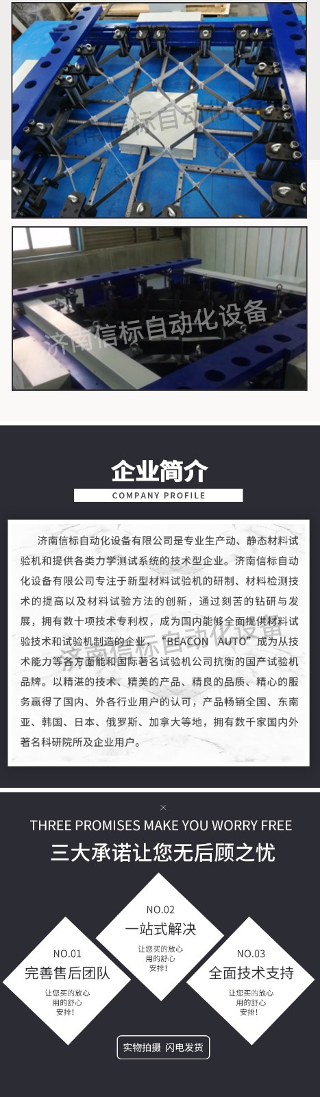 濟南信標自動化設備有限公司主要生產:動靜態萬能疲勞試驗機,接骨板彎曲試驗機,縫合線拉伸疲勞試驗機,髖膝關節磨損試驗機,電子萬能試驗機、液壓萬能試驗機、巖石三軸、四軸,電液拉力試驗機,材料試驗機,高低溫蠕變,高低頻疲勞,拉伸、扭轉、杯突等二十多個系列兩千多個的品種。