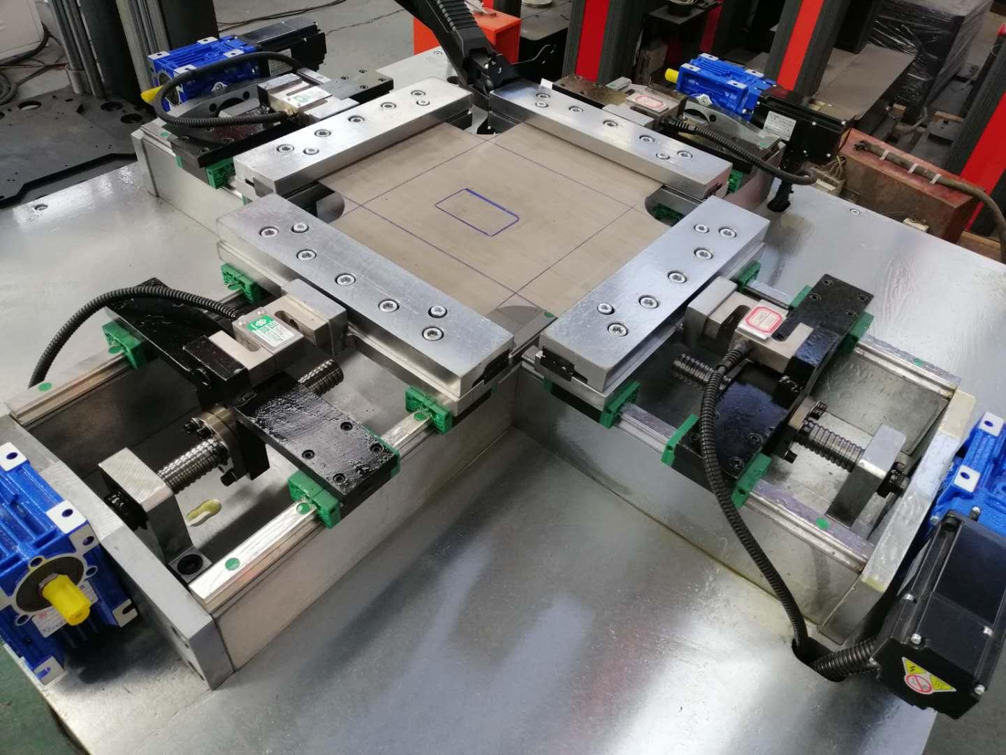 如附圖所示,四軸拉伸測試系統用于測試格室節點在四個方向拉伸狀態下,節點及母材的力學性能,四軸聯動,原位拉伸,四根拉伸主梁交叉布置,每套拉伸夾具下面分別布置兩組導軌,起到導向和拉伸時防轉的功能,夾具及橫梁移動時同步運行,X Y 方向分別布置測力傳感器和變形傳感器,分別測量兩個方向力及變形的變化。專用測試軟件,滿足新標準中相關要求。